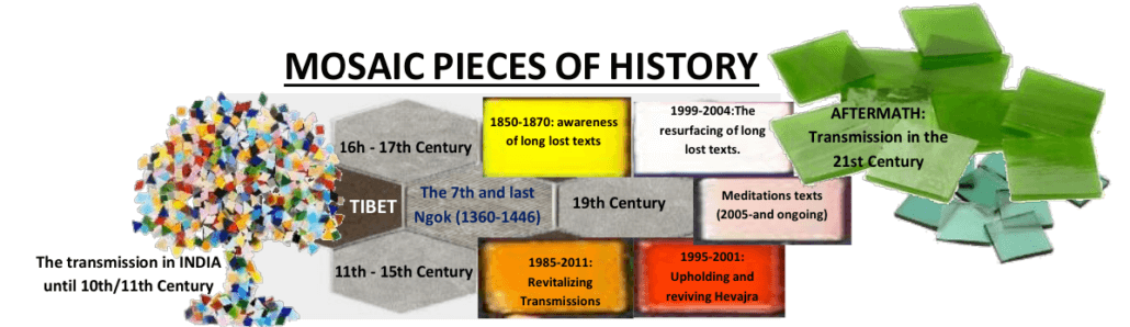 Marpa Lotsawa Chokyi Lodrö (1000-1081) was the founder of the Kagyü school of Tibetan Buddhism and as such his teachings and tantric transmissions spread to most Kagyu sub-lineages. Although most of the Kagyü lineages extant today come from Marpa, Milarepa, Gampopa, his disciples (most notably teh first Karmapa and Pamo Drupa), and his disciples’s disciples (the four primary and eight secondary Kagyü lineages), Marpa’s legacy itself is best represented by what he transmitted to his disciple Ngok Chödor. Chödor was a non-monastic practitioner and he continued to practice mostly Marpa’s main yidams described in the Hevajratantra, Hevajra and Nairātmyā. These mandalas, within a group sometimes called “the Seven Mandalas of the Ngoks” continued to be transmitted within the Ngok family lineage over the centuries, and also spread in other lineages, most notably the Drikung lineage in the 16th century. In the 19th century, they were compiled by Jamgön Kongtrül Lodrö Thayé (1813-1899) in the Treasury of Kagyü Mantras (Kagyü Ngakdzö) and have been transmitted within that context since that date.